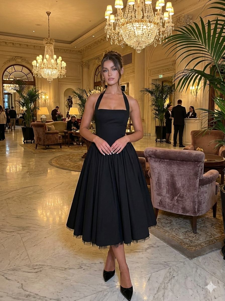 This dress combines simplicity with sophistication. The open-back detail and halter neckline elevate the look, making it perfect for special occasions while remaining comfortable and easy to wear.