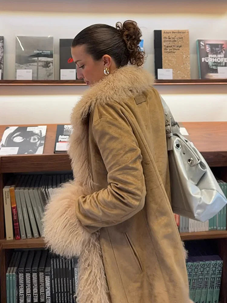 Designed for women who love effortless winter style, this medium-length coat features a modern spliced design with faux fur effect detailing for a bold yet elegant look.