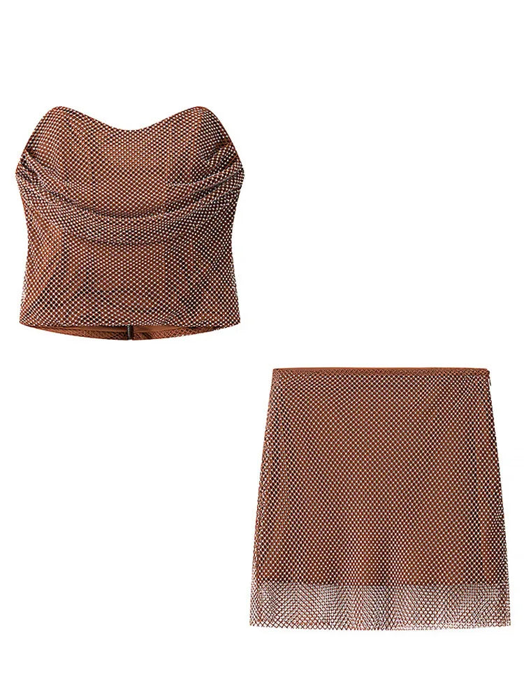 Featuring a sleek strapless tube top adorned with shimmering rhinestone details, this set creates an eye-catching look that feels luxurious yet effortless.